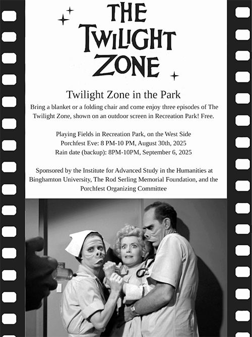 Bring a blanket or a folding chair and come enjoy three episodes of The Twilight Zone, shown on an outdoor screen in Recreation Park! Free. Sponsored by the Institute for Advanced Study in the Humanities at Binghamton University, The Rod Serling Memorial Foundation, and the Porchfest Organizing Committee